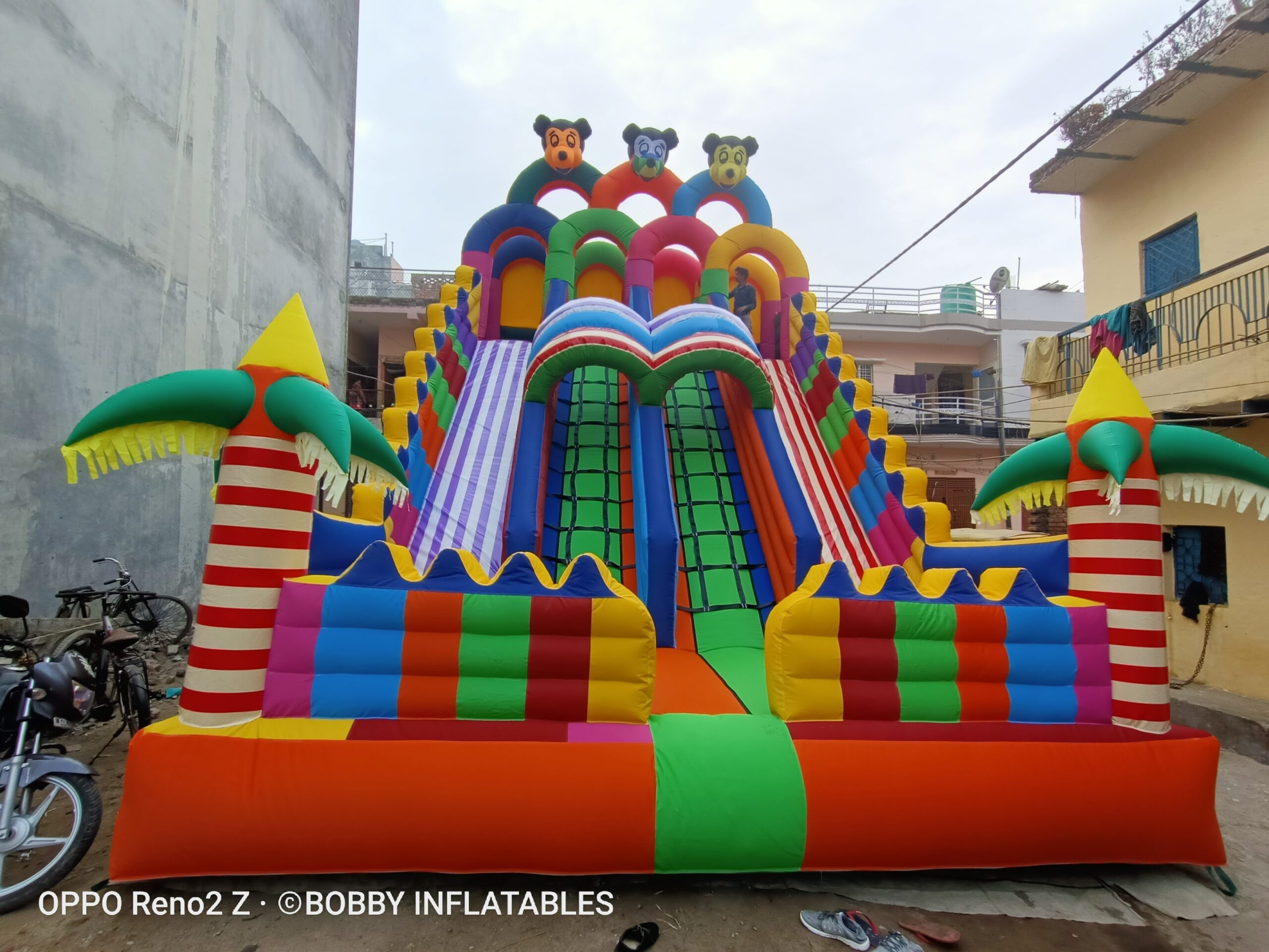 Size: 18×25 Feet Type: Jumping/Sliding Bouncy Include: 1.5 HP – 2 Blower Material: SRF Material Brand: Paras Inflatbles An inflatable slide bouncy is a fantastic attraction that combines the excitement of a bounce house with the thrill of a slide. These types of inflatables are popular for parties, events, and recreational areas because they offer both bouncing fun and sliding excitement. Here’s a breakdown of what to consider and what you might find:Inflatable Structure:Material: Typically made from durable materials like PVC or nylon. The material is chosen for its strength and ability to withstand repeated use.Construction: Includes a bouncy area with a slide that is securely attached. The slide is usually covered in the same durable material to ensure a smooth and safe ride.Single Slide: A straightforward design with one slide and a bouncy area at the base.Dual Slide: Features two slides, which could be side by side or stacked, allowing multiple children to slide at once.Themed Slides: These might include themes like castles, jungle gyms, or cartoon characters to enhance the visual appeal. …Read Less