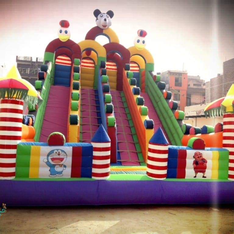 Size: 18×25 Feet Type: Jumping/Sliding Bouncy Include: 1.5 HP – 2 Blower Material: SRF Material Brand: Paras Inflatbles An inflatable slide bouncy is a fantastic attraction that combines the excitement of a bounce house with the thrill of a slide. These types of inflatables are popular for parties, events, and recreational areas because they offer both bouncing fun and sliding excitement. Here’s a breakdown of what to consider and what you might find:Inflatable Structure:Material: Typically made from durable materials like PVC or nylon. The material is chosen for its strength and ability to withstand repeated use.Construction: Includes a bouncy area with a slide that is securely attached. The slide is usually covered in the same durable material to ensure a smooth and safe ride.Single Slide: A straightforward design with one slide and a bouncy area at the base.Dual Slide: Features two slides, which could be side by side or stacked, allowing multiple children to slide at once.Themed Slides: These might include themes like castles, jungle gyms, or cartoon characters to enhance the visual appeal.