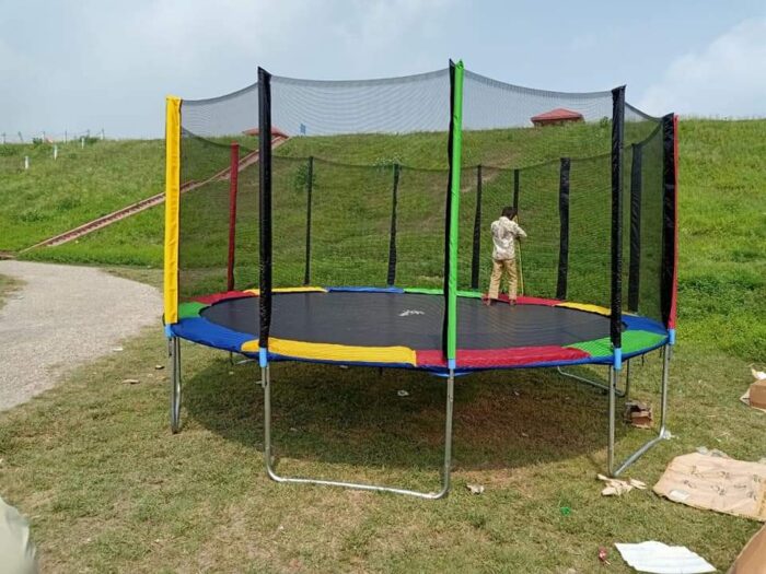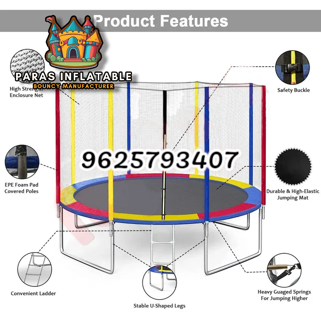 Looking for Jumping Jhula Price in India? Look no further! PARAS iNFLATABLES brings you the ultimate in backyard fun – the 16×16 Ft Jumping Jhula, also known as a trampoline. This massive jumping platform is perfect for energetic kids and playful adults alike. It provides hours of entertainment, promotes healthy exercise, and creates lasting memories. Applications: Backyard Fun: Create a joyful space for kids to burn energy and have a blast. Fitness Training: Improve agility, coordination, and balance with a fun workout. Family Bonding: Enjoy quality time together, fostering laughter and connection. Technical Specifications: Feature Specification Size 16 Ft x 16 Ft Material Galvanized Steel (Frame), Mesh Fabric (Jumping Mat) Spring Count 108 Weight Capacity 350 Kg Product Weight 100 Kg Color Multicolor Warranty Checking Warranty (We’ll update this section soon!) Includes Ladder, Spring Pad, Springs, Jumping Mat, Safety Net Installation Process (DIY-friendly): Clear the Area: Choose a level, soft surface free from obstacles. Assemble the Frame: Connect the galvanized steel poles using the provided instructions. Attach the Springs: Secure the springs to the frame using the designated hooks. Lay the Jumping Mat: Spread the mat evenly over the springs, ensuring proper attachment. Install the Safety Net: Attach the net poles to the frame and secure the netting around the perimeter. Enjoy the Fun! Double-check all connections and let the bouncing begin! Why Choose PARAS iNFLATABLES? Superior Quality: We use high-grade galvanized steel for a sturdy frame and UV-resistant mesh for lasting durability. Safety First: Our Jumping Jhulas come with a safety net enclosure for peace of mind. Unbeatable Value: Get the best Jumping Jhula price in India with exceptional quality from PARAS iNFLATABLES (Our Own Brand). Flexible Payment Options: Enjoy Cash on Delivery (COD) with just a 10% advance payment or convenient EMI options on credit cards. Ready to take the leap? Don’t settle for just “Jumping Jhula Price” or “Jumping Jhula Price in Delhi” searches. Invest in Joy! Buy your PARAS iNFLATABLES Jumping Jhula (16×16 Ft) today and unlock a world of bouncing fun for your entire family. Call to Action: Visit our website or contact us now to place your order and experience the PARAS iNFLATABLES differ